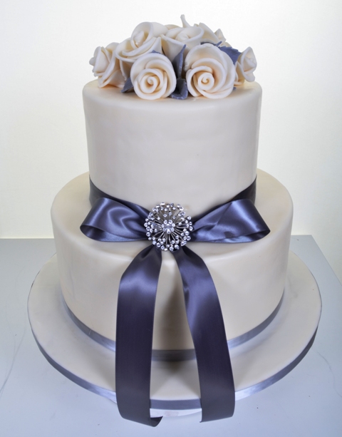 The only word that describes this piece in any adequate manner is “elegance.” Understated, unpretentious, quietly attractive, this design denotes confidence, style, and impeccable taste. Two round tiers, in sparkling white, are adorned at the base by ribbon bands of luminous pearl grey. A luxurious clutch of delicately hand-formed roses of white charmingly embellishes the crown of the cake. Snippets of grey satin ribbon are artfully placed among the blooms, in a continuance of the pearl grey accent. The focal point of the work is the large looped bow of grey satin, accentuated by a brilliant starburst of glittering crystal. This lovely and versatile design is ideal for any occasion – birthday, bridal shower, anniversary, or wedding. For that special someone with charm, grace, and humility, this is the one!