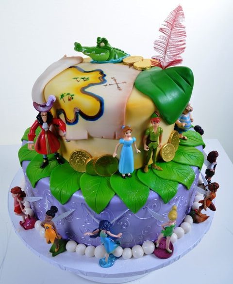 Who among us has not wished to at least visit “Neverland”? I dare say it’s a wish that has entered every child’s head, at some point. First introduced as “the Never Never Land” in the theatre play Peter Pan, or The Boy Who Wouldn’t Grow Up by Scottish writer J. M. Barrie, first staged in 1904, it was possibly influenced by “the Never Never”, a contemporary term for outback Australia. It came to be known as “Neverland” in a subsequent 1928 script. Neverland’s best known resident is Peter Pan, who famously refused to grow up, and it is often used as a metaphor for eternal childhood (and childishness), immortality, and escapism. In this lavish design, we can certainly see the why anyone would want to vacation there. Two lush round tiers, one in a fairly-land shade of lavender, ornamented with hand-drawn artwork in delicate silver. The upper tier is done up in shades of a sandy beach, and supports a pirate’s treasure map, and gold doubloons. The base tier is ringed by fairies galore (they are the primary users of magic in Neverland), and features Tinkerbell, herself. Wendy and Peter are in the process of hiding from Captain Hook, and his henchman Mr. Smee. Also making an appearance is the ever-present crocodile that is responsible for Captain Hook’s missing hand. Outsized and otherworldly exotic leaves decorate the piece, and this homage to J.M. Barrie’s magnum opus is a fabulous birthday design for any child – or anyone who longs to return to the simplicity of childhood.