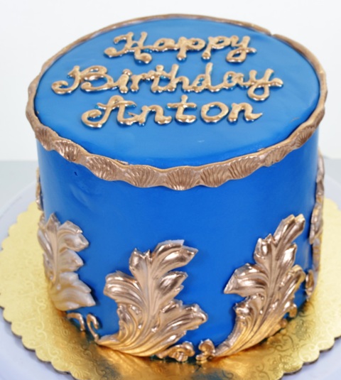 This design harkens back to the days of ancient Greece and Rome. The startling blue is a color closely associated with Greece, and the large gold leaves are reminiscent of the crowns of oak leaves woven for those who were victorious in battle or game. The golden decoration around the top of the cake also looks like a royal “circlet.” In Italy, and in Greece, birthdays are not traditionally celebrated after a child reaches a certain age. Instead, “name days” are celebrated. This custom originated with the Christian calendar of saints: believers named after a saint would celebrate that saint’s feast day. In many countries, however, there is no longer any explicit connection to Christianity. The concept of name days is similar to the more common birthday, except that the association of a name to a day is entirely arbitrary. Whether the occasion for this stunning affair is birthday or “name day”, this centerpiece will make it a noteworthy event.