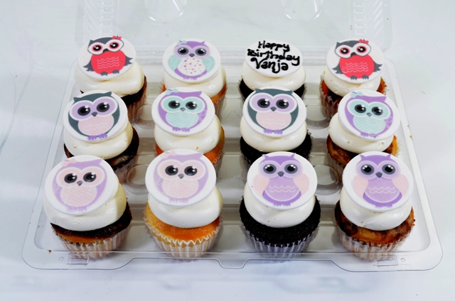 Legend has it that owls bring intuition, wisdom, and the ability to see what other do not see, including the capacity to see beyond deceit and masks. They are also traditionally a harbinger of change. Owls possess acclaimed night-vision, and have long figured in myth and folklore. They are found in all regions of the Earth except Antarctica and some remote islands. Their feathers are uniquely adapted for silent flight, giving them a definite advantage over the small insects and other birds on which they subsist. But these little guys are just C-U-T-E! Scrumptious individual cupcakes in white cake, dark rich chocolate cake, or a swirl, mixing the two, are iced in rich sweet icing, then topped with a disc upon which an owl has been painstakingly painted. Those huge eyes, and calm demeanors are unmistakable. Who wouldn’t want to just grab one of these adorable treats? Make your birthday a memorable one for all your guests with “Owl Cupcakes.”