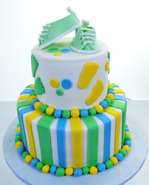 This colorful design in delicate pastels is just the thing for a baby shower, or “Welcome Home Baby” affair. Appropriate for either sex baby (for that traditional couple who doesn’t “want to know”), these shades of yellow, green, and blue will play well for either a baby girl or baby boy. The pristine white base color is the perfect canvas to show off these cheerful stripes, large beads that trim the base of each tier, the triads of jaunty little dots, and last, but not least, those little silhouettes of bare baby’s feet, all five toes perfectly intact, on each one. Atop this piece, in a pose that exudes a sprightly and high-spirited attitude, a pair of stylish baby shoes, in fashionable mint green, is carefully placed. Whether it’s a boy or a girl, chances are, this baby will be up and running before the parents can believe it! Make sure you get a picture of “Baby Feet” before they’re all grown up!