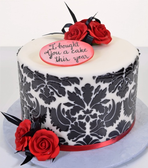 Well, for all you guys out there who know what it’s like to be in the “dog house” for forgetting your wife’s birthday, or your anniversary (or maybe BOTH, in the same year), here’s a design with a special, heart-felt message, just for you. This piece isn’t overly gratuitous (which would only call further unwanted attention to your failing(s) last year), and yet it isn’t just something you threw together, either. It had to be planned, in advance, and some genuine thought had to go into it (kudos for that!). You cannot go wrong with a classic black and white motif, especially when it’s this beautiful damask motif. Accented with red ribbon and some smart red roses (did we mention that red roses are the universal emblem of true love?), this should get you back into her good graces, in no time. The little oval-shaped placard is a public confession that you fell short of the mark, last year, but you REALLY want to make it up to her, this trip around the sun. Willingness to admit your faults, and resolve to correct them, plus that little touch of humor, is quite the winning combination.