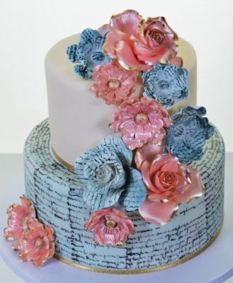 This unique design has a very old-fashioned charm about it. Two round tiers comprise the infrastructure, and each tier is bound by a narrow band of gold trim. The upper layer is simplicity itself, if pristine white. The lower layer is decorated in an “old world”, quill-rendered, font reminiscent of what poets of yore used when writing sonnets. Add to that some beautiful roses, no doubt made from paper that was discarded, when said poet was not satisfied with the result, complemented by several stunning roses in pink, delicately dusted with a tinge of gold, and you have an elegant masterpiece of “cakery.” Blushing peonies, also in pink, airbrushed with a golden tint, could almost be said to be “gilding the lily”, but find a perfect niche in this work of art. “Paper Roses” is an ode to likes of Byron, Keats, Joyce, and Shakespeare.