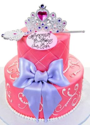 This work is obviously for Princesses only! No others need apply! Two large round tiers are iced in “fairy pink”; one is embellished with a quilted motif and the other with ornate hand-drawn flourishes and intricate curlicues. A row of delicate hand-piped pearls rings the base of each layer (pearls are ALWAYS appropriate, for any princess). A stunning oversized bow in a pale periwinkle satin is placed between the tiers, and adds softness and an accenting splash of color. The deliciousness of the cake underneath all this frothy pinkness is matched only by the sumptuousness of the bejeweled crown and scepter that grace the top of this piece. What little 6-year-old princess could resist such a treat? “Princess Pink Birthday” is a sure way into her heart, and to ensure a birthday that will not soon be forgotten.