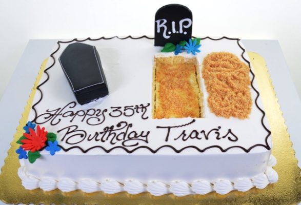 It seems that the age at which one is considered “Over the Hill”, or at death’s door, gets younger and younger, doesn’t it? Actually, this overemphasis regarding turning 35 is meant in fun, and also a nod to the persistent (and may I add “obnoxious”) practice of deliberately and prematurely announcing on Internet sites (such as Facebook) the death of a celebrity. Hoaxes regarding the deaths of no less than Morgan Freeman, Johnny Depp, Jim Carrey, Tom Hanks, and even Lady Gaga, have circulated numerous times, when the truth of the matter was much as Mark Twain commented: “The report of my death was an exaggeration.” This novelty (and slightly “grim”) design depicts a recently dug grave, with coffin awaiting the lowering into the earth. The headstone is in place, and all that remains is for the mourners to arrive. In the meantime, everyone should get into “party” mode, and dig into this delicious (albeit possibly “final”) dessert! “R.I.P. – Over the Hill at 35??” is for that friend or relative with a good sense of humor who’s not really particularly sensitive about his age!