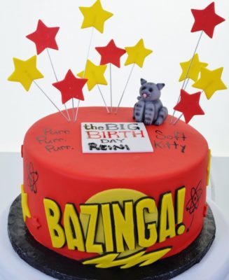 “Bazinga!”is a word used by Sheldon Cooper, in “The Big Bang Theory) to signal that what he said immediately before this utterance was to be taken as a joke. Sheldon Lee Cooper (PhD) is a fictional character on the popular CBS television series, portrayed by actor Jim Parsons. Sheldon has a very high I.Q. but he is in possession of almost nothing in the way of social skills. This design, in bold primary colors of red and yellow, accented with touches of black, is homage to Sheldon, and his strange ways. The symbols for the atom, sun, moon, and stars are prominently displayed, as is “Soft Kitty”, the title feline of the “Soft Kitty” song that Sheldon, Penny, and Sheldon’s mother sing to one another, when the other is not well. For the devotee of the TV show, or perhaps for that person in your life who bears more than a passing resemblance to Sheldon, this work is a spot-on selection to ensure the success of your event!