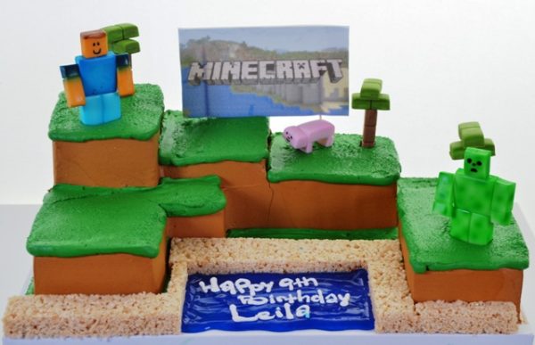 Minecraft was released for the PC in 2009. The enormously popular game was originally created by Swedish programmer Markus “Notch” Persson. The creative and building aspects of Minecraft allow players to build constructions out of textured cubes in a 3D procedurally generated world. Other activities in the game include exploration, gathering resources, crafting, and combat. Multiple gameplay modes are available, including survival modes where the player must acquire resources to build and maintain his or her health and hunger, a creative mode where players have unlimited resources to build and the ability to fly. For your little 9-year old gamer, this multi-leveled piece, edged with a “Rice-Krispy Treat” border, is sure to be a smash hit, as the focal point of the occasion. “Minecraft, Redux”, with Steve, Creeper, and the infamous “pink pig” can be custom-ordered for your party.