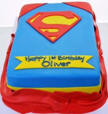 “Superman” has been around since 1938, in one form or other, and his popularity has really never waned. He has long been considered the all-American superhero. Righting all wrongs, protecting the weak from the strong, flying about in his blue leotards and famous red cape, he’s the epitome of all that’s good and wonderful in the world. You really could say the same thing about a one-year-old baby boy – what could be better, or be a more meaningful occasion to celebrate? This design takes that challenge to heart. The oblong single-tier design is done up in those familiar primary colors that make up Superman’s costume. It’s so recognizable, that it’s become a part of our “collective consciousness.” The stylizes “S” within the shield, against the blue background and the billowing red cape. He may be only one, but he’s most likely already been introduced to the most famous superhero of all time, in one way or another. Let’s hope the birthday boy, inspired by this design, attempts to emulate all the fine qualities that the superhero possesses, as he grows up.