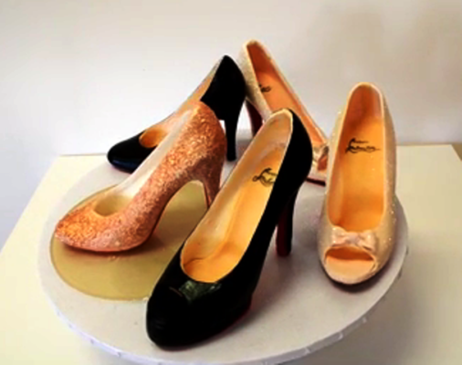 Even if the inside labels were covered, anyone with any fashion savvy would know immediately that this spectacular collection of high heels is by Louboutin, with one glance at those “sammy red-bottoms.” The red-lacquered soles are now his virtual “signature” (fyi – the red-bottom color code is registered as Pantone 18-1663 TPX). Celebrities around the world adore his awesome footwear. Danielle Steele is said to be his #1 fan, reportedly owning 6,000 pairs of his shoes. These “to die for” heels are a sampling of his wares, and a hands-down winner as accoutrements to whatever your selection of cakery for centerpiece. Just picture it in your mind – a beautiful tower of cake, topped with one of these magnificent stilettos! Any one of these (or a pair!) would do justice to any single-, double-, or triple-tiered design, for any party where females might be present!