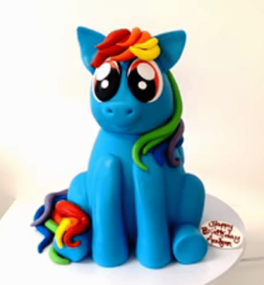 My Little Pony is the entertainment franchise developed by Hasbro which is marketed primarily to girls. It started as a line of plastic pony toys which have been produced since 1983. The ponies feature colorful bodies, manes and a unique symbol on one or both sides of their flanks. These are referred to in the two most recent generations as “cutie marks.” The brand was moderately profitable from early 1990s until the beginning of the 2010s when its popularity drastically exploded after the introduction of the fourth generation, following the unexpectedly great success of the 2010 animated television series. “Rainbow Dash” is one of the most popular, in the collection. Her character epitomizes the elements of loyalty, bravery, courage, and a kind heart. Her figure is masterfully and meticulously reproduced here, hand molded and tinted. Her magical “rainbow mane” is one of the things that’s made her so in-demand, and is represented beautifully by our decorators. She’s the perfect (and adorable) centerpiece for a young girl’s birthday celebration.