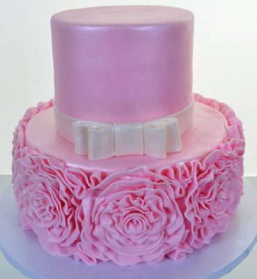 This design in luscious and sparkling pink is simply magnificent. Beginning with two simple round tiers, iced in a pink created especially by our experts, a contrasting band of simple white edges the base of the top tier, culminating in a classical double-loop bow. Then the fun begins! The side of the lower layer is strikingly embellished with hand-crafted, impossibly large pink roses. Each of these blooms is spectacular on its own merit, but side-by-side, overlapping one another, they create a glorious illusion of an other-worldly garden where flowers grow to gigantic proportions, even dwarfing the people admiring them. This stunning affair is picture-perfect for any event: birthday, anniversary, engagement party, wedding – you name it. This is a classic “go to” piece for your catered affair.