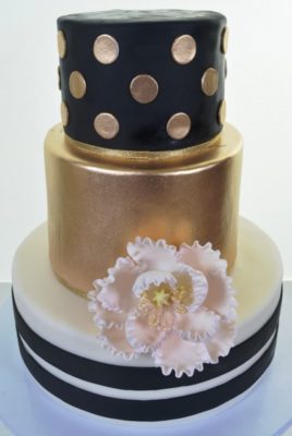 This eclectic piece combines elements from many styles, in grand fashion. Utilizing a classic black and white color scheme as a base, the design is aggrandized with a bit of a “Midas touch.” The base tier is elegance, personified, with its simple white icing dramatically set off with two broad ribbons bands of sophisticated black. The top tier of black is given a jaunty attitude with golden polka dots. The middle tier is brilliantly dressed in a burnished gold, taking center stage, yet giving a nod to classical taste with a large white peony. This design truly has something for everyone: discretion, savoir-faire, glitz! What’s not to love? “Ritz and Glitz” will get your event off to a rousing start.