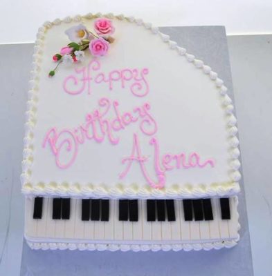 For the promising student, a budding prodigy, or even a “wunderkind”, this creation is all about celebrating the birthday of someone who loves music. This custom-shaped and meticulously carved piano, all in pristine white, is a veritable work of art. Ebony and ivory keys are painstakingly carved into the design, and look so real that someone might actually try to play a little tune on this keyboard. The hand-piped border adds a finishing touch, and the birthday greeting is prominently displayed on the top. A lovely spray of roses and lilies adds a light touch of accenting color and femininity to this work. Besides, what’s a birthday cake without delicious flowers made of icing for people to covet? The birthday girl is certain to appreciate this acknowledgement of her talent and ambition.