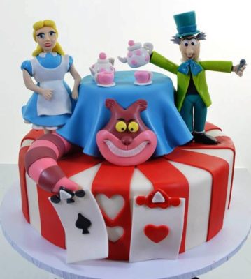 This famous scene is unmistakable – it’s “The Mad Hatter’s Tea Party”, of course! Alice, the Mad Hatter, and the Cheshire Cat are all here, and there are references to the frightening Queen of Hearts, as well, in the playing cards, as well as the red-and-white striped motif on the tier. If you recall Lewis Carroll’s signature work, you’ll remember that the tea party consisted primarily of Alice being requested to solve numerous nonsensical riddles, and that she eventually left, saying that it was the most ridiculous tea party she’d ever attended.The party is in full swing, here, with the Cheshire Cat making an unannounced appearance (and most likely also a “dis”appearance) at the event. To add to the merriment, this design is set on a carousel, so that it continuously rotates for the viewing pleasure of all the guests. For any birthday, or countless other possible events, this centerpiece is certain to make your occasion a jocular one.