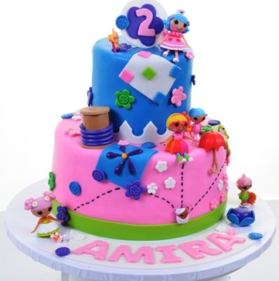 Lalaloopsy is an American line of plastic rag dolls from MGA Entertainment. They were originally released in 2010 as Bitty Buttons but the brand name was changed to Lalaloopsy shortly after launch. Each doll character was created with a fictional theme, reflecting the day she is born, the fabric she is sewn from, and her pet. Isaac Larian, CEO of MGA Entertainment, said that the dolls were “designed to teach kids that everybody is unique in their own special way.” With their button eyes and hair in a variety of colors from the rainbow, they were a huge success for the holiday season, in 2010. This charming design is comprised of several of the more popular models along with fabric samples, spools of brightly colored thread, and LOTS of buttons. Set against a background of a two tiered superstructure, in pink and blue, this colorful and delightful piece is ideal for any little girl’s birthday bash!
