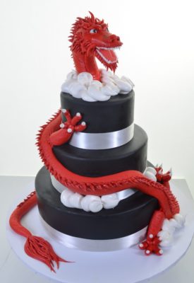 Traditionally, red dragons are notoriously passionate with a short fuse, tending towards an ill-temper. A red dragon is imbued with considerable prowess in battle, andas a guardian, the red dragon is formidable. In China, red is an especially auspicious color, denoting power, wealth, and good luck. What better wishes for a birthday, anniversary, or any event, than these? Three tiers in mysterious, darkest black, bound by ribbons of white satin, form a veritable dark tower of cakery, by which this fierce specimen is rising up through the clouds. As his head emerges through the fluffy white clouds on the top layer, he declares his dominance and surveys his realm. He appears as though fire might start erupting from his mouth at any second, and razor-sharp teeth accompanied by deadly claws are capable of massive damage. But he’s here in a peaceful context, only to bring all good things to the guest of honor at this celebratory event.
