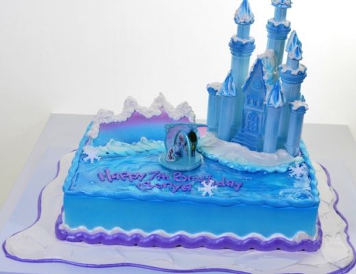 The popularity of “Frozen” seems to not only wane, but to increase, exponentially. This phenomenon has been unlike anything else in recent history, and a huge boon to the Disney corporation. The appeal appears to be universal, and little girls all over the world have come to embrace Elsa’s decision to be her own person, no matter what. This lovely design is another in our “Frozen” collection. A single tier is covered in “ice blue”, and edged at the base in white and lavender. The surface of the tier simulates a frozen lake, and in the middle is an ice floe where Elsa and Olaf appear. Behind the floating pedestal, Elsa’s castle arises, magnificently reaching to the sky. Drifting snow banks and delicate snowflakes add to the ambience, and this piece is certain to elicit a chorus or two of “Let It Go!” Fair warning!