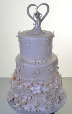 This stunning work of art is everything a wedding cake should be. It pulls elements from many different styles and blends them, seamlessly. Three round tiers, in bridal white, form a demure tower of cakery, without stealing attention from the bride (bad form to detract from the bride on her most special day!). The entire base tier is hidden beneath a bountiful blanket of the most lifelike “Thousand-Year Roses” you’ll ever see on a cake. As the eye travels up to the top the design, the number of roses and petals begins to diminish, lending a lighter air. The graceful, modern cake topper is at once romantic and stylish, and continues the monochrome color scheme. From traditional, to modern, to romantic, this is a tour de force from our designers and decorators, epitomizing and coalescing all the essentials into an unforgettable centerpiece, and symbol of the day. For your special day, this dramatic work is perfection.