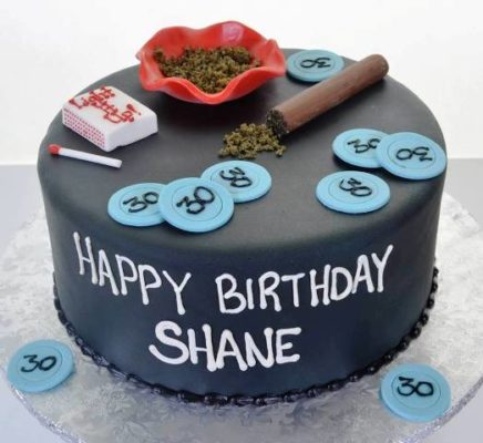 Those birthdays that end in a big round ZERO really do seem to hit us harder, don’t they? They bring to mind that another decade has passed, and set us to contemplating our lives, in a way other years don’t seem to. However, considering that “30” is the new “20”, there’s little to worry about, right? This big round tier is, yes, iced in black; but in this case, black is not representative of being “over the hill” so much as it is a statement of excellent taste – there’s nothing more “classic.” A row of shiny black beads edges the base of this bounteous tier, and there are chips galore, noting the infamous “30”, lest anyone forget. An expensive-looking cigar rests atop the cake; some of the ash from the cigar has made it into a bright red ashtray, but some has spilled outside the ashtray. A small matchbox is standing close by, ready for action. Cigars are traditionally celebratory, in nature; however, as someone famously once said: “Sometimes, a cigar is just a cigar.” We’re not certain which explanation is applicable here, but this is an excellent selection for the occasion of a cigar aficionado’s 30th birthday bash!
