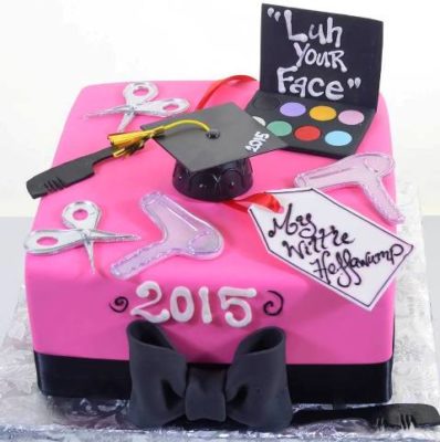 This novelty piece is specifically for that friend or family member who has just completed her studies of cosmetology, in all its various disciplines; not a simple task. Requirements for a cosmetology license vary from state to state, but all require hundreds of hours of classroom training, and additional hours of practical, supervised experience. It also happens to be one of those professions that is highly unlikely to be taken over by “technology”; not a bad choice! A large square tier is iced in “hot pink” and banded at the base by a broad ribbon of black satin. A large black bow adds a touch of finery. The top of the cake is replete with many of the familiar tools of a hair stylist, and make-up artist – scissors, styling combs, hair dryers, and a palette of eye shadows. A mortarboard takes center stage, indicating a successful completion of the aforementioned courses, and 2015 marks the year. A lively and colorful work, this captures the spirit of the occasion in fine fashion!