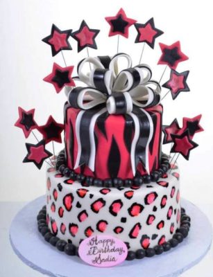 If the color theme here were red, white, and blue, this design would resemble a star-spangled banner, but in this iteration, it simply says “Wowza!” Two large round tiers are dressed to dazzle in this piece. The bottom tier has a pristine white background that shows off a leopard print, done up in fuchsia, set off by bold black. A leopard print, in any color, denotes strength, speed, and magical qualities; all of great significance, for a birthday celebration. The top tier is primarily in fuchsia, accented by bold black abstract stripes. Single strands of large black beads finish off the base of each tier. A huge, multi-looped bow in black and white crowns this affair, and five-pointed stars in fuchsia and black, attached to wires, explode from the top and sides of the cake. If excitement and drama are your end goals, you cannot go wrong with this selection!