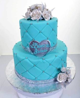 The quinceañera is the rite of passage for a girl of Latin American heritage, and typically the occasion for a very large celebration. It marks the change from girl to woman, child to adult. This lovely centerpiece will be right at home for this occasion. Demure and unassuming, it also speaks to the sophistication of a young lady, entering the prime of her life. Two generous round tiers are uniformly dressed in a lovely shade of aqua. Each tier is “embossed” in a quilted motif, with tiny, intricate “stitching” and tiny silver beads mark each corner of each diamond shape. Each tier is edged at the base with a ribbon of glittering crystal, adding a nice touch of “bling.” A clutch of glorious silver-dusted roses rests at the base of the bottom tier, and a larger collection crowns the top of the piece. Simple, yet elegant, this design is the epitome of all a cake for such an important gathering should be.