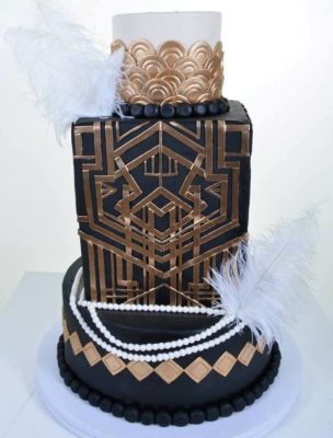 This magnum opus is homage to (perhaps even a study of, if you will) the ever-popular “art deco” school of design. Art Deco is more of a “mood” than a style, or discipline. It instantly conjures images of unimagined wealth, ostentation, and a “devil-may-care” mind-set. The elements in this fabulous design are all part-and-parcel of that flamboyance and attitude. Two round tiers, with a towering oblong tier in between, form a monumental tower of cake. The geometric shapes include sharp angles and rounded arches, echoing a great gate – perhaps to heaven, itself; the black and gold color scheme is bold and dramatic; strands of luminous pearls are carelessly draped along the natural curves of the design. Large white plumes extend off the cake, and give the illusion of floating in mid-air. The entire piece seems to be suspended on a cloud, beckoning. For any occasion, this design is ready, willing, and able to serve as an unforgettable masterpiece of cakery.