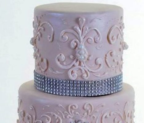 This magnificent wedding centerpiece is nearly beyond verbal description. Five incredible tiers in the palest “blush pink” have arisen, not from the sea, but to the same breathtaking effect as Botticelli’s “Birth of Venus.” The base tier is square and solid, creating a reliable foundation for the four round tiers, each a work of art unto itself, that rest on top of one another. The three middle tiers are each adorned with a row of tiny luminous pink seed pearls that glisten demurely. The top and base tiers are wrapped in ribbons of glittering crystal. Spectacular hand-drawn artwork of flourishes and curlicues decorates each and every tier, and sparkling starbursts and diamond-like jewels add drama and glamour. A large initial “V” inscribed on the middle tier denotes the newly-weds’ surname, and the smallest tier, at the top, is an ideal “take home” for bride and groom, to be shared on their first anniversary, as is customary. This bejeweled and dazzling wedding cake is nothing short of a masterpiece, and it can be yours…