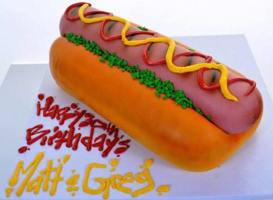This novelty design, for a pair of twins, has “Fun!” written all over it. A ginormous hot dog is resting in an equally large accommodating hot dog bun. The bun has all the appearance of soft baked bread – you can almost smell it! Green “relish” can be seen, seeping out the sides of the delicacy. The hot dog itself is perfect, including grill marks, and a line of ketchup, accompanied by a line of mustard. Lifelike in every detail, this is perfect for a couple of youngsters who really LOVE hot dogs – and are still of an age that they look forward to birthdays! Time for a party!
