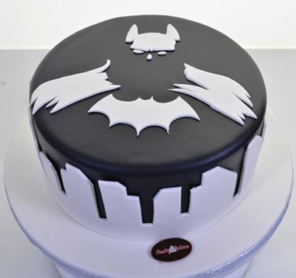 There are few symbols more iconic than that of “Batman.” Since his creation, he’s been a popular and mysterious superhero of the first caliber. The enigmatic mask with the bat ears creates a silhouette that instills fear in those with larceny in their hearts. This design trades the black silhouette for a white one, against a black background. The mask and eyes, the “wings” of his cape, and the Bat Logo are all in white, but just as unmistakable. The side of the cake displays the skyline of Gotham City, also in white, against black. This stark, and memorable design is ideal for any celebration in honor of a devoted fan of the legend of Batman.