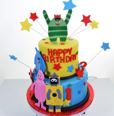 This design is absolutely ideal for the young “YoGabbaGabba!” fan! Almost exclusively in primary colors, the cheerful red, yellow, and blue theme everything a birthday cake should be: sunny, upbeat, and lively! All the gang is her: Foofa, wearing her signature flower; Muno, the friendly red cyclops; Plex, the magical yellow robot; Toodee, the blue, arctic cat-dragon; and Brobee, the youngest member of the band, and its drummer. “YoGabbaGabba!” premiered on Nickelodeon in 2007. The show was developed by two Southern California fathers, Christian Jacobs and Scott Schultz, and is noted for its indie-culture guest stars and bands, and for drawing visual inspiration from 8-bit video games and H. R. Pufnstuf, among other classic television shows.Along with the friendly cast of characters, the piece in enhanced by stars, on wires, arising from the cake, and also decorating the sides of the two tiers. Enormously popular among the younger set, many children would be overwhelmingly delighted with this birthday celebration centerpiece.