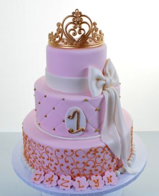 This charming work is absolute perfection for a girl’s first birthday. Three tiers in “princess pink” arise from a pristine white platform. Each tier is encircled at its base with a finishing flair – a strand of white beads, a narrow band of piping, or a broad ribbon band in velvety white, with a flawless bow and trailing ends. The base layer is covered in festive golden curlicues and the middle tier is embossed with a quilted motif. Tiny golden beads accent the corners of each diamond shape. The top tier is un-adorned, so as not to take away any of the drama and elegance of the simply breathtaking crown of gold that is supports. This crown appears to be magically constructed of “fairy gold”, and the front morphs into an appropriately innocent and lovely heart-shaped design. Altogether, this work is a masterpiece of enchantment and purity.