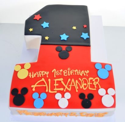 “Numeral” cakes, particularly for juvenile birthdays, are all the rage, right now – even for that very first, and most important birthday. This generous single tier is hand-shaped into a very large number “1”, and iced in dramatic red and black, on top, and pristine white on the sides. On the black section of the top are starts, in various colors and sizes. On the red section, even if you didn’t recognize that font that the yellow “Happy 1st Birthday” is written in (it’s actually a facsimile of Walt Disney’s handwriting!), you are certain to recognize the other hallmark of Disney, the most famous mouse silhouette in the world – Mickey Mouse! Imaged here in blue, yellow, white, and of course black, he’s unmistakable. For any fan of Mickey Mouse, Disneyland, or Disneyworld (and that probably covers just about everyone, doesn’t it?), this design is a sure-fire hit!