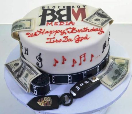 This specialty design was created for the birthday bash of one of the partners in “Block Boy Media”, the professional management firm that promotes Rap and Hip-Hop artists. This large single tier, in white, is the perfect canvas on which to display the various and sundry accoutrements of the “hip-hop” life. A plethora of hundred dollar bills is strewn about the design, in a careless manner, denoting the storied money involved in success. A key chain fob with a Porsche logo also attests to the riches that can be attained, in the business. Musical notes adorn the side of the cake, and the top bears the likeness of the Block Boy Media emblem. Once again, our designers have met the task set before them!