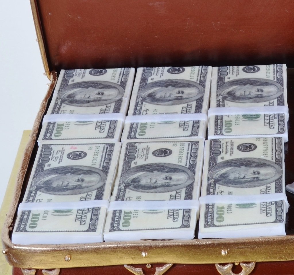 The contents of this luxurious Louis Vuitton briefcase, detailed to perfection, might belong to two different people:a banker and a purveyor of religious talismans; or perhaps a cleric who’s just absconded with the receipts of the weekly collection plate, and is about to make his getaway in an ill-gotten Mercedes Benz!Whatever the case, the owner will be protected, one way or the other.Whatever the money won’t take care of, perhaps the crosses and bling will!This creation will have everyone talking long after the celebration ends.