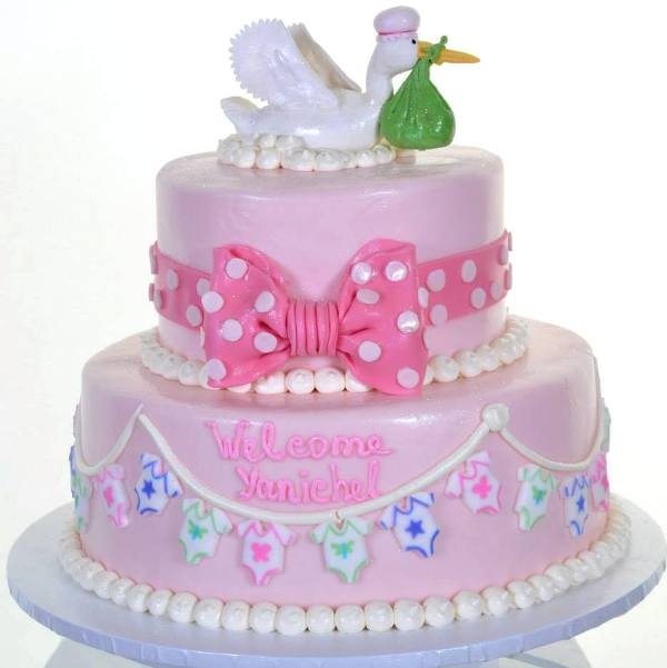Tiny pink baby shoes ornament the top of this dainty work, signaling that “It’s a girl”.Three round tiers in princess-pink are ornamented with riot of butterflies, dots, and flowers, in pink, lavender, and green.Icing scallops in pink and white, dress up the top and bottom tiers, and base of each layer is encircled with a ribbon band of complementing color.A large icing bow in spring green embellishes the center tier and draws the eye toward the green drape of icing that contains the proclamation on the top.A photograph of this lovingly prepared treat would be perfect in a scrapbook detailing the series of events leading up to the joyous event.