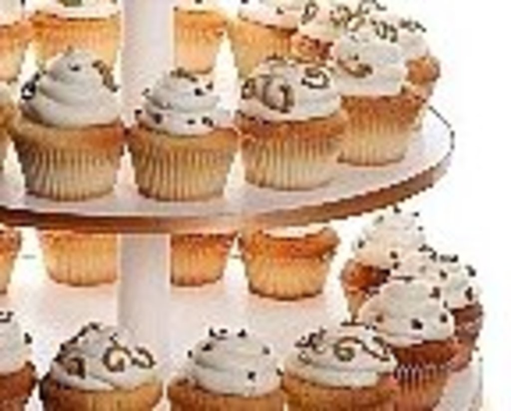 Gourmet cupcakes are all the rage these days, and here is a perfect alternative to a traditional cake for any occasion.Four platforms in graduated sizes support dozens of cheerful, frilly delicacies; each one of these beauties is piled high with luscious fluffy frosting, and embellished with a generous helping of multi-colored sprinkles.A pillar separates each platform and shows off the individual dainties to their best advantage.On the very top is a small full-sized layer, as homage to tradition that can be used to display any message apropos to the celebration.A very chic selection -guaranteed to impress!