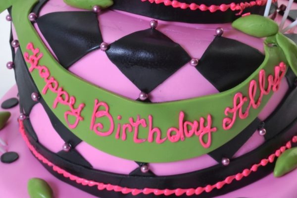 lives abound in this flashy creation!Three topsy-turvy tiers dressed up in pink and black form this foundation – one with black dots, the center tier bedecked in a classic harlequin motif, and the top tier sporting broad black stripes.At the base of each tier is a black ribbon band, adorned with a strand of pink beads, and the bottom tier is completely encircled with scrumptious strawberries, dipped in dark, rich chocolate.A green drape of icing displays the birthday message, while dozens of green olives fill out the decor, adding a “carnival” effect.