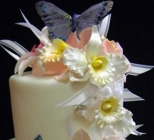 Spring is here!Flowers burst into bloom and butterflies emerge from their warm winter cocoons, all to glorify this creation.Each radiant flower is handcrafted and tinted to perfection.Three tiers of snow white fondant, edged with pearl trim, form the foundation, while the arrangement of blossoms winds its way up to the top in a lovely sweeping arc.The butterflies appear to flutter, as the soft glitter on their wings twinkles in the light.Can you almost catch a delicate scent wafting from the lush blooms?