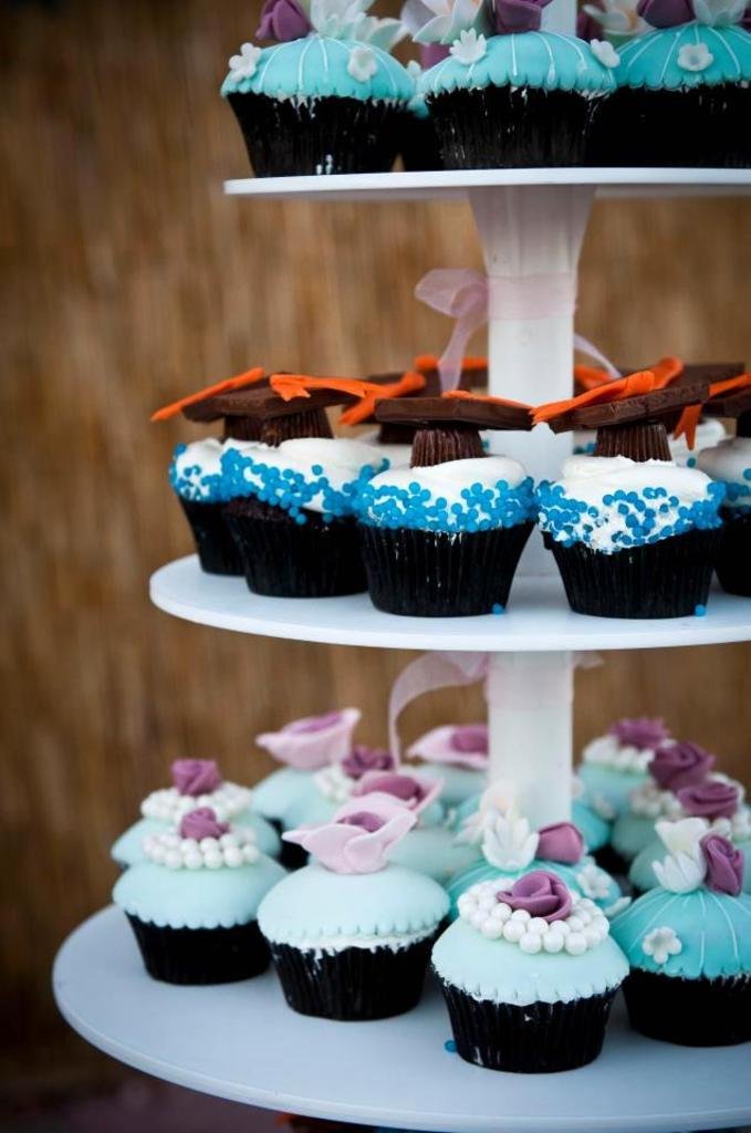 It’s a day of celebration for everyone when a new graduate enters the world. Whether it’s college, high school or kindergarten – it’s a new milestone in a life, and definitely an occasion worth of a party! Here we have a lovely combination that illustrates both the mortarboards and tassels – and a representation of a gift of pearls that might be presented to the female graduate. Both festive and lovely – this is a cupcake tower to be cherished with photos – and enjoyed by the taste buds!