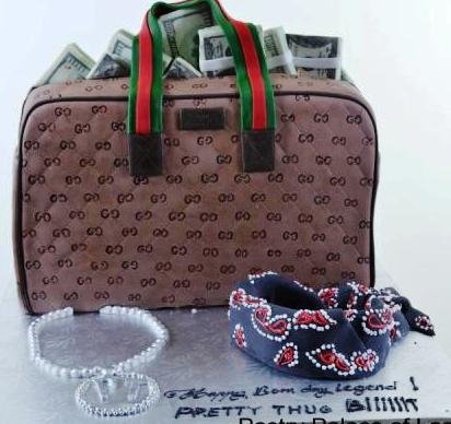This replica of a small Gucci duffle, stuffed full of cash has been created in painstaking detail; from the original Gucci fabric, sporting the “double G” logo, to the straps in signature red and green, every feature is perfectly represented, and unmistakable.Any connoisseur of luxury luggage will recognize this piece, immediately.The pearl necklace and bracelet add an extra touch of bling to the affair, linking all these expensive props to the “Pretty Thug” video, by Prodigy, which is referenced in the “Birthday” greeting