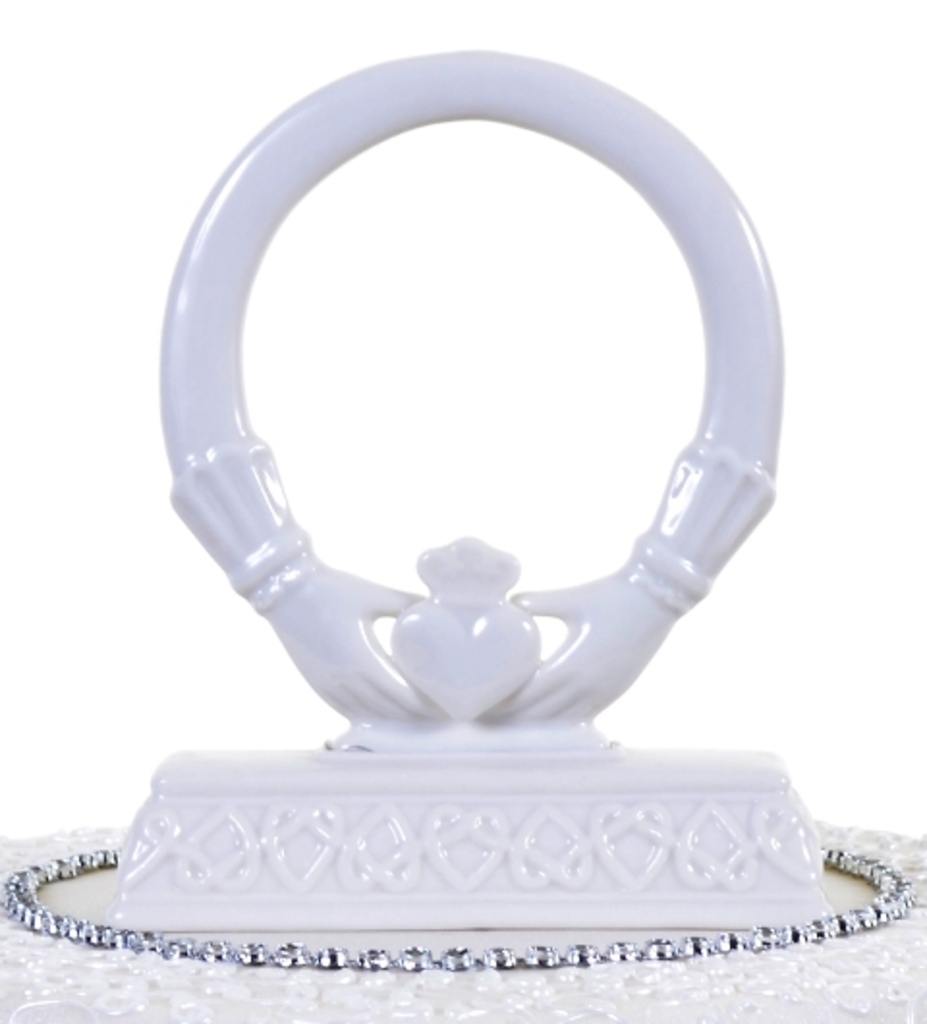 Symbolism abounds in this design, which is a traditional Irish wedding ring. A “ring”, which represents love, with no beginning or end, is formed by two hands, which gently clasp a single heart. That single heart indicates that two are now joined as one. A diamond is forever, and this one crowns the heart, signifying “Eternal love.” This symmetric creation expresses all this beautiful sentiment. Keats said it best when he wrote: “Beauty is truth, truth beauty,-that is all Ye know on earth, and all ye need to know.”
