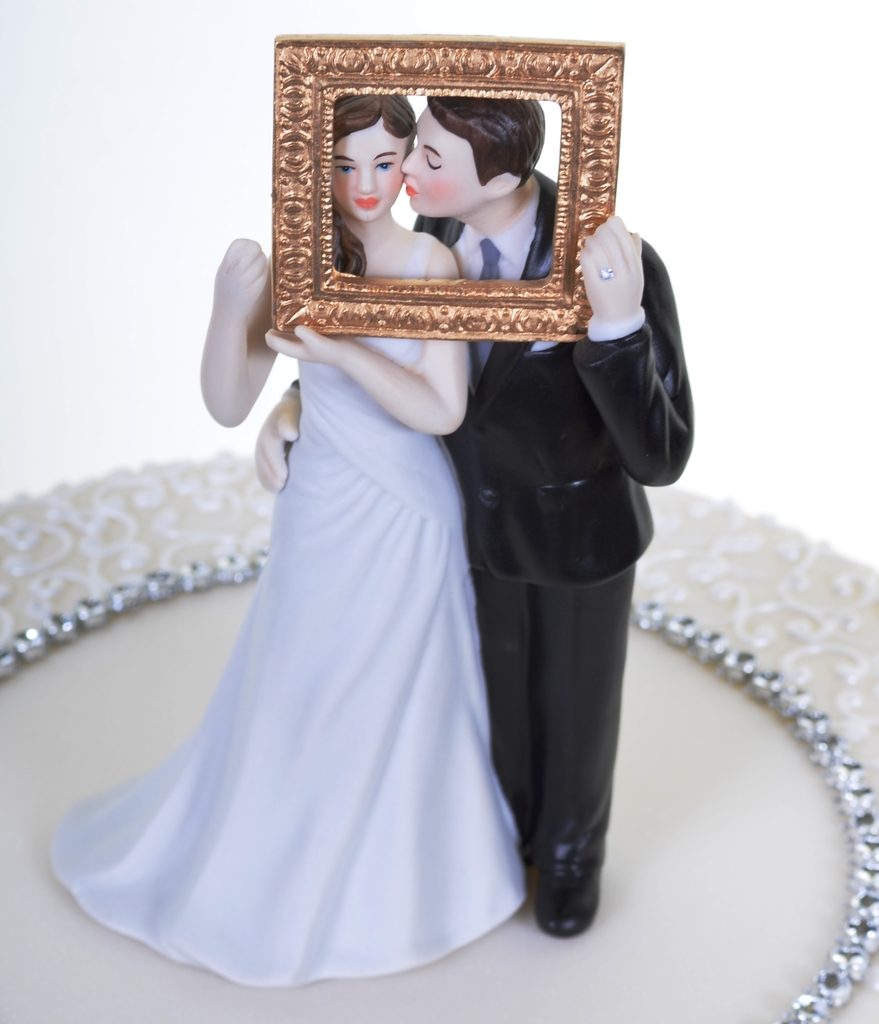 What could be sweeter than the bride and groom, posing for their “Picture Perfect?” The charming and chaste kiss on the cheek is contrasted by the groom’s hand stealing around his beloved’s waist. The golden frame will capture this moment for eternity.