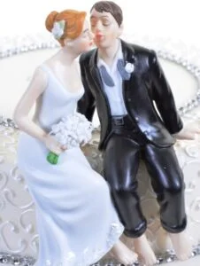 Shown here is a “Tender Moment” between bride and groom after the hustle and bustle of the big day. The pomp and circumstance of the ceremony, the photographs, the gaiety of the reception, the good-byes to the guests, are all now relegated to a memory worth keeping. The couple has removed their shoes, he has loosened his tie, and they are enjoying the warm, calm afterglow, and imagining the rest of their lives together. Happy day!