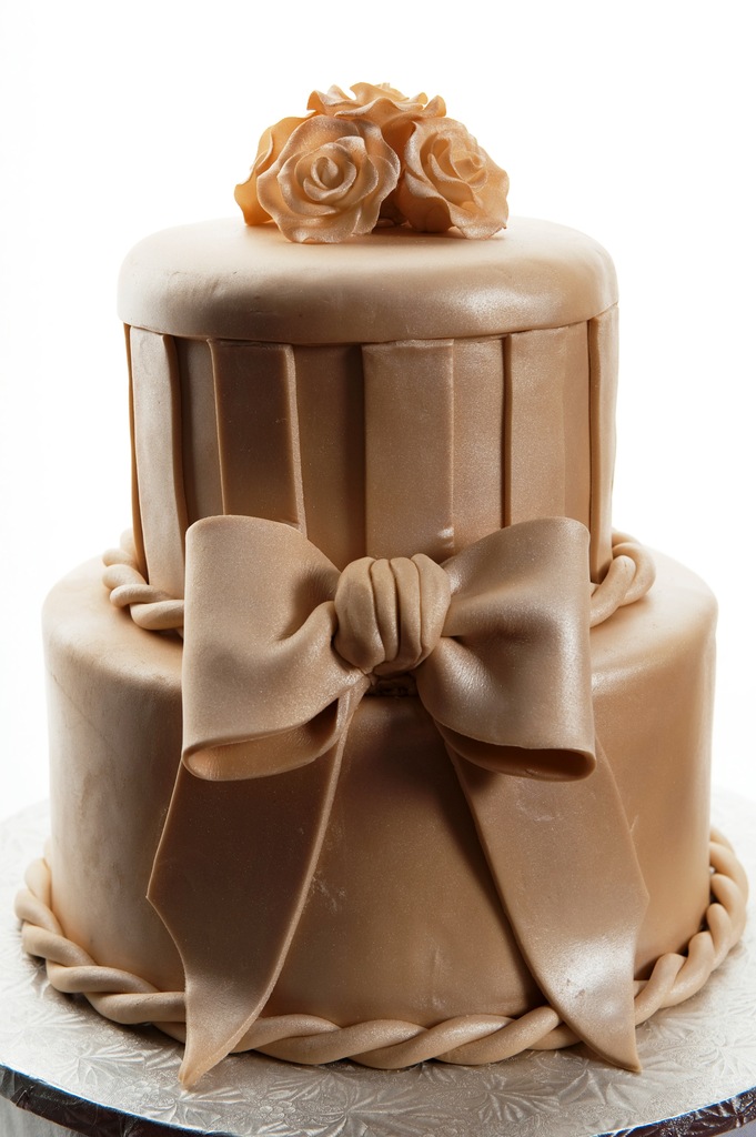 If you’re in the market for something a little different – here’s a cake with modern appeal. Shown here in a two-tier design perfect for intimate affairs – added layers and design elements increase the size and make it even more interesting!As shown, the oversized bow of fondant is the centerpiece of this tone-on-tone beauty.Combining several elements – vertical stripes, twisted rope borders, rounded corners and coordinated icing flowers atop – these qualities offer an appealing (and delicious!) alternative to traditional cake styles.Tell us – what design elements would YOU add for the 3rd and 4th tiers?