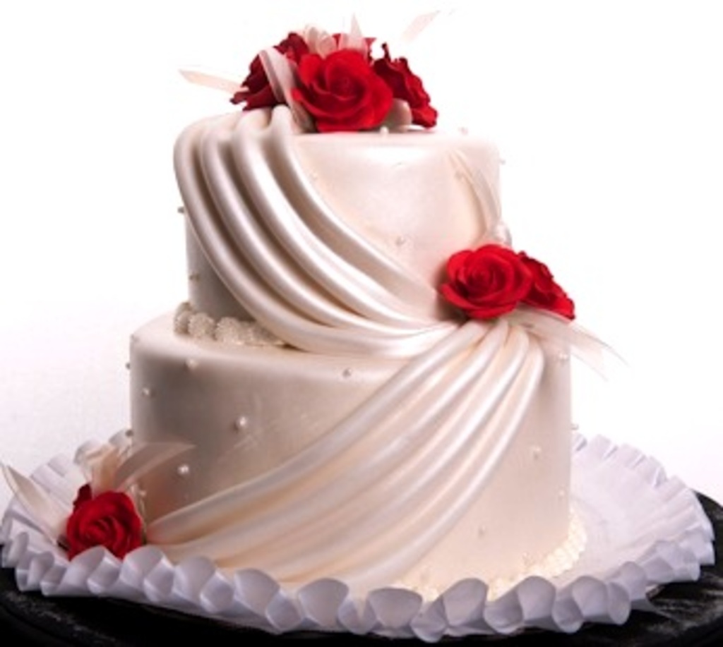 Understated yet modern.Simple yet elegant.This extremely popular design of flowing swag drapes, accented at each gathering point with stunning red cream roses makes its appearance many times in our catalog.A smooth fondant layer also includes well-placed sugar pearls on the face of each tier for added interest.Imagine the color combinations, the florals you can choose – the way you can make this perfect wedding cake representation uniquely yours for the event.