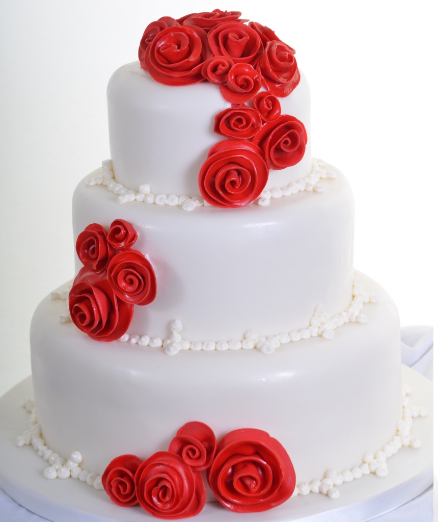 Do the words “bold elegance” belong together in a sentence?In this case – absolutely.The smooth, clean, rounded and simple lines of this three-tier cake show off bold red rose sprays of cream icing to perfection.White tone-on-tone hand beading on each tier includes offset accents that lead the eye in interesting directions.What might sound plain-and-simple on paper is simply stunning in real life.Can you picture your wedding colors represented here?(It’s not hard to do!)Simply unique in its beauty.
