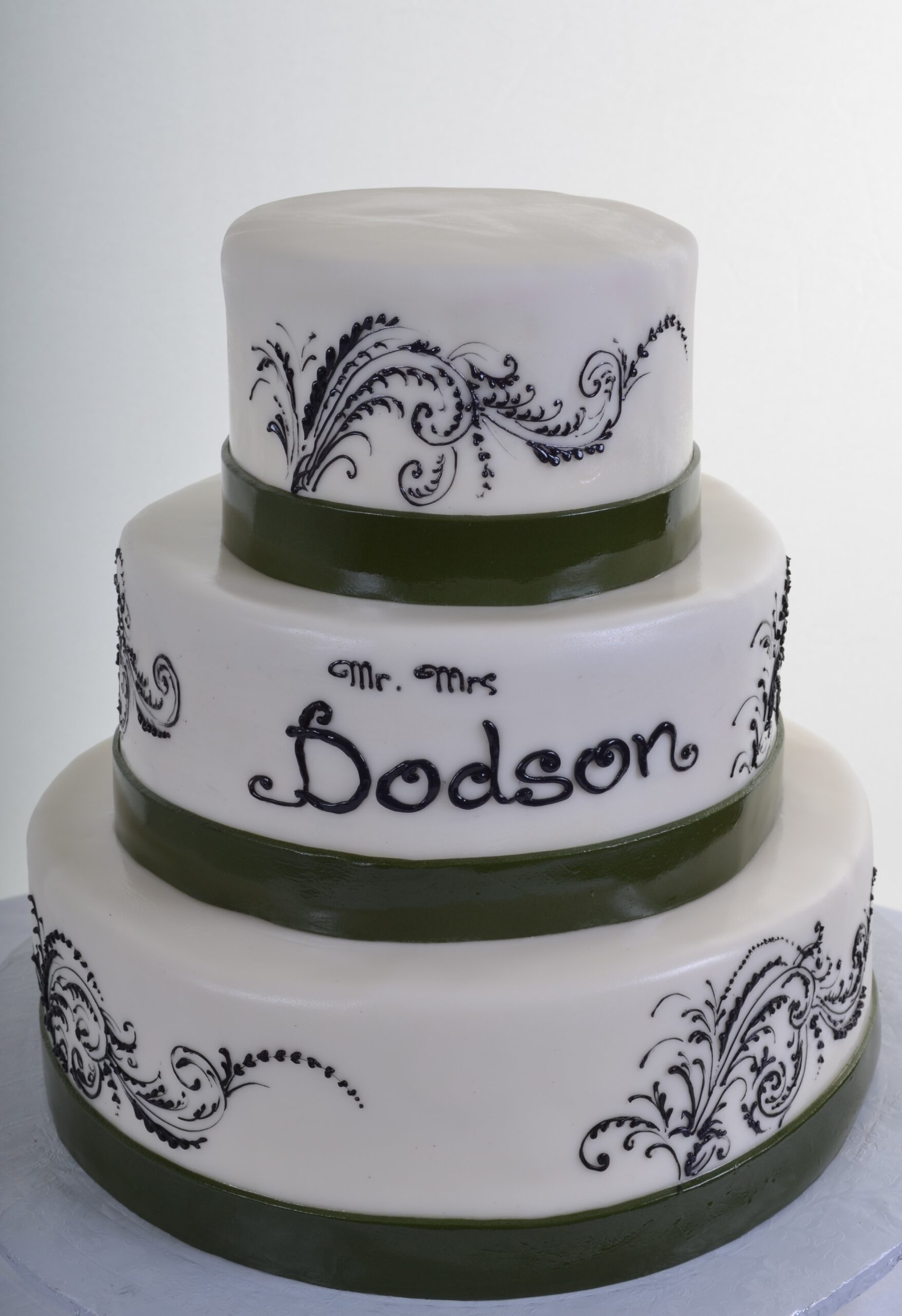 There’s nothing quite as stylish as “Black and White” and this simple, yet smart design says it all.The bold flourishes are meticulously executed and the ribbon banding finishes off each tier perfectly.Featured here in a classic, round three-tier cake, the smooth white fondant covering each layer provides the perfect backdrop for the hand-piped black design.Add the simplicity of “Mr. & Mrs. Wonderful” on the center tier and this is a piece that will be remembered!