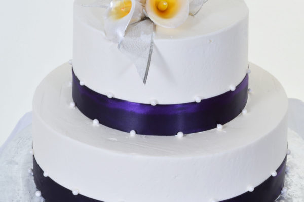 Sometimes less really is more. The two round tiers look pristine in their perfectly iced finish Vibrant ribbon decorated with delicate pearls finishes each layer and adds the perfect color counterpoint to the lustrous sugar Calla Lily bouquet that tops the confection. Gossamer silver ribbon accents the flowers and completes the look.