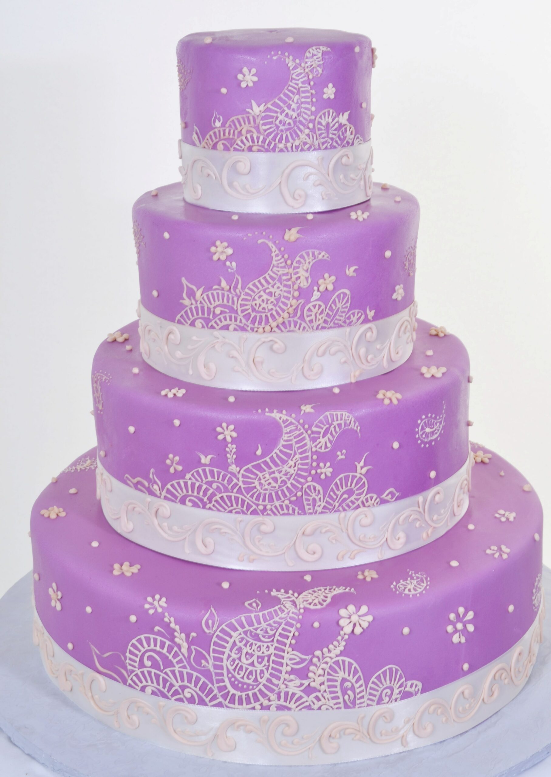 Henna has been used for centuries in many types of ceremonies – and weddings are no exception.The intricate paisley design – hand-piped onto this fabulous four-tier masterpiece – denotes good luck, joy, and fertility.Each round tier is covered with a matte-finish purple fondant, wrapped with ribbon at the base – and serves as a magnificent background for the ivory design.A dazzling effect that will enhance the festivities at any wedding.